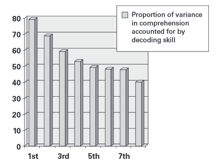 How the relationship between decoding and comprehension changes over timeThe numbers on the bottom axis represent year of schooling. In the first year of schooling, a child’s ability to decode words accounts for almost 80% of their reading comprehension.
