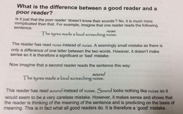 The resource states that all good readers use context to decode text, something reading scientists have shown is incorrect, as Louisa Moats taught us last year. We don’t work out what unfamiliar words ARE from context, we work out what they MEAN. We have to get them off the page first, using our knowledge of sounds, spellings and word parts and our vocabulary knowledge.