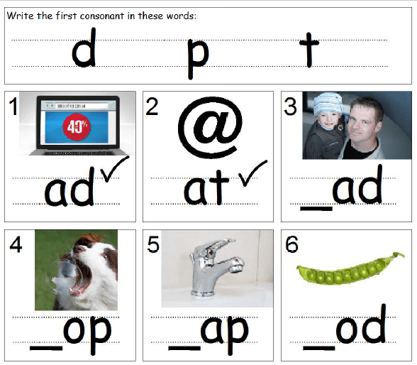 Completing 10 words by listening to each word, identifying the first sound and writing the missing first letter from a choice of three letters – “d”, “p” or “t”. This very simple phonics task is also quick and absolutely easy for adults.