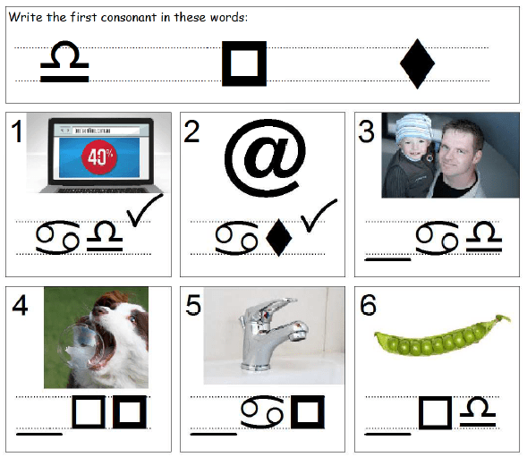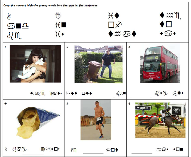 The same as Task 2, but in Wingdings. Adults can usually do this task fairly easily, though they have to put a little conscious thought into which letter represents which sound, and how to form it – it’s not fast and automatic like when using familiar symbols, and if the pictures were removed they would still struggle to read the words.