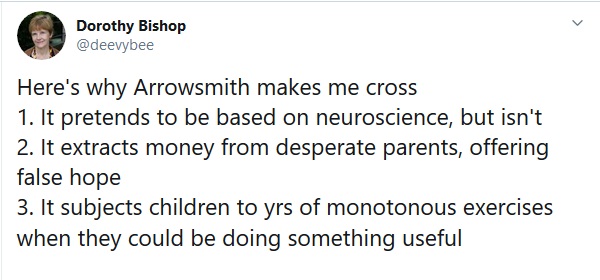 Last year an article about the Arrowsmith program which at first seemed promising appeared in the journal Learning: Research and Practice. Dorothy Bishop quickly and succinctly pointed out why scientists cannot and do not take it seriously: